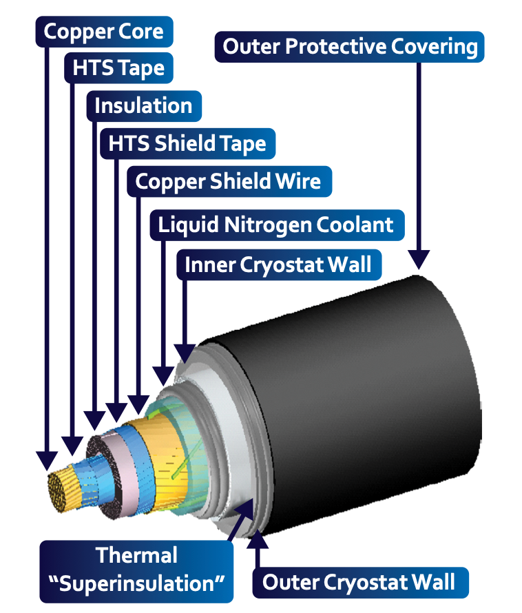 Diagram of a superconductor showing layers including copper core, HTS tape, insulation, HTS shield tape, copper shield wire, liquid nitrogen coolant, inner cryostat wall, outer cryostat wall, and outer protective covering.